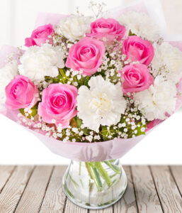 White carnations nestled in amongst pretty pink roses and gypsophila make up this delicate bouquet. Delivered in bud for longevity, these unbeatably priced blooms promise to unfold their magic gradually after reaching the lucky recipient. Sent in our signature Eflorist box for safe transit, this bouquet is sure to enchant the recipient from the moment they open it. Enjoy our nationwide delivery and know exactly when the flowers are delivered with tracking. Eflorist, where value meets beauty.