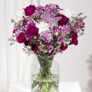 A delightful selection of long-lasting Carnations in shades of pink, purple and white complemented with pink Limonium and delicate Waxflower blooms. Paired with a keepsake butterfly pick for an extra special touch. Our letterbox flower gifts are delivered in specially designed letterbox friendly packaging and protected by fully compostable brown paper wrap, ensuring a wonderful and creative gift for the recipient.