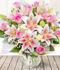 A stunning bouquet in which fragrant lilies stretch their star-like petals out amongst pink roses and gypsophila, creating a graceful mixture of delicate blooms. Sent in a protective Eflorist box, it arrives safely and offers a delightful unboxing experience. Your super-fresh flowers will arrive in bud, ready to transform in front of your lucky recipient within 48 hours from delivery, all with tracked delivery and nationwide coverage giving you peace of mind. With its exceptional beauty and unbeatable price, this bouquet is the perfect choice to brighten someone’s day.