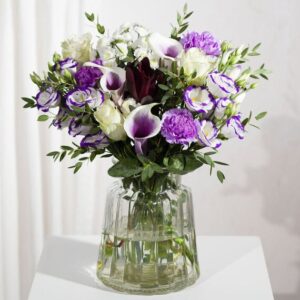An exquisite collection of elegant Calla Lilies and vibrant purple blooms. This bouquet showcases striking Calla Lilies paired with rich purple Carnations, delicate Lisianthus stems and pure white Athena Roses, complemented by lush greenery. Featured on ITV’s This Morning as part of their Mother’s Day flowers 2026 review! Please note colour of Calla Lily may vary slightly from image.