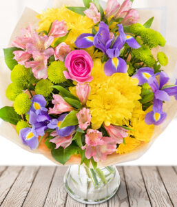 Spring Hedgerow is a colourful bouquet of stems, perfect for brightening their day. A pretty pink rose is surrounded by yellow chrysanthemums, soft pink alstroemeria, and vibrant iris. Sent in a special Eflorist box designed to protect the stems and provide a pleasant unboxing experience. The flowers arrive in bud, and with just a splash of water and our included flower food, the blooms will gradually open up within two days, revealing their beautiful final form. And with tracked delivery, you can track the progress of your vibrant bouquet, knowing exactly when the surprise reaches your loved one. Despite its beautiful appearance, this bouquet remains budget-friendly.